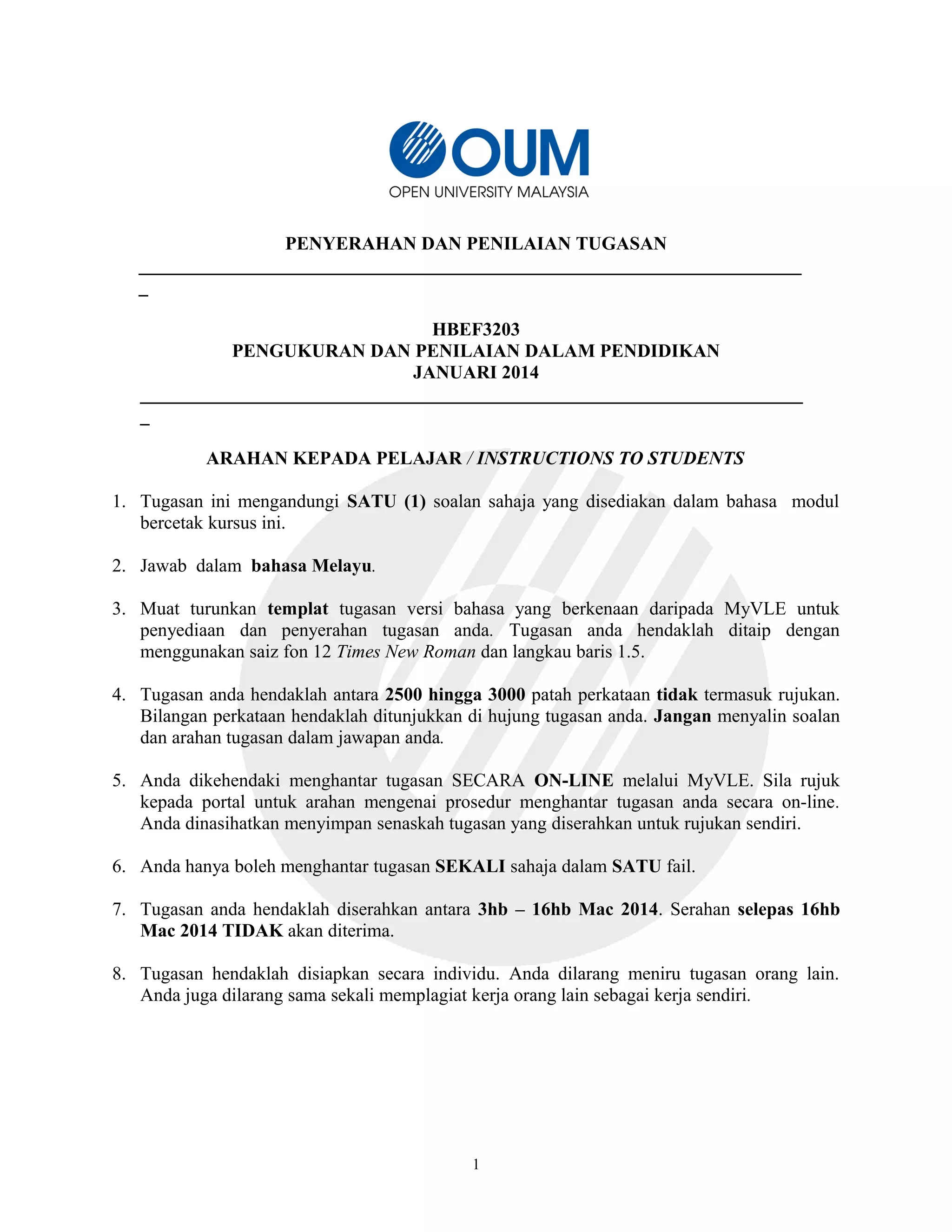 Tugasan ini melibatkan satu soalan yang memerlukan pelajar menyediakan dan mentadbir kertas ujian untuk satu kelas pelajar serta menulis laporan tentang pencapaian mereka. Pelajar mesti mengikuti format tertentu, termasuk penulisan dalam bahasa Melayu, jumlah perkataan dan penghantaran melalui myvle. Tugasan ini menyumbang 40% markah keseluruhan kursus dan terdapat pemotongan markah bagi plagiarisme.