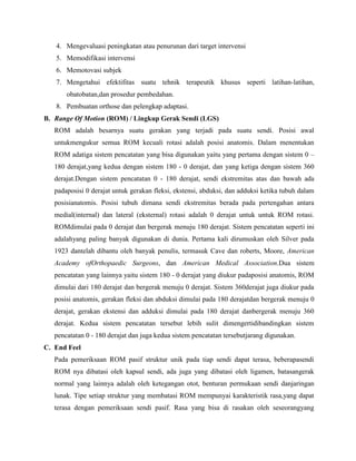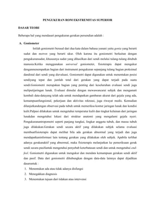 Dokumen ini menjelaskan tentang pengukuran range of motion (ROM) pada ekstremitas superior dan inferior menggunakan goniometer, serta pentingnya evaluasi sendi untuk menilai fungsi gerakan dan diagnosis. Pengukuran ROM melibatkan beberapa sistem pencatatan, seperti 0-180 derajat, dan jenis-jenis end feel yang dapat membantu fisioterapis dalam menentukan kondisi pasien. Selain itu, dokumen ini juga mencakup prosedur pemeriksaan dan tujuan pembelajaran bagi mahasiswa dalam memahami dan melakukan pengukuran ROM.