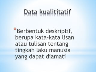 Dokumen tersebut memberikan penjelasan tentang metodologi penyelidikan kualitatif termasuk definisi, jenis-jenis data kualitatif, persampelan dan populasi. Ia juga membincangkan prosedur persampelan seperti persampelan mudah, persampelan tujuan dan persampelan bola salji.