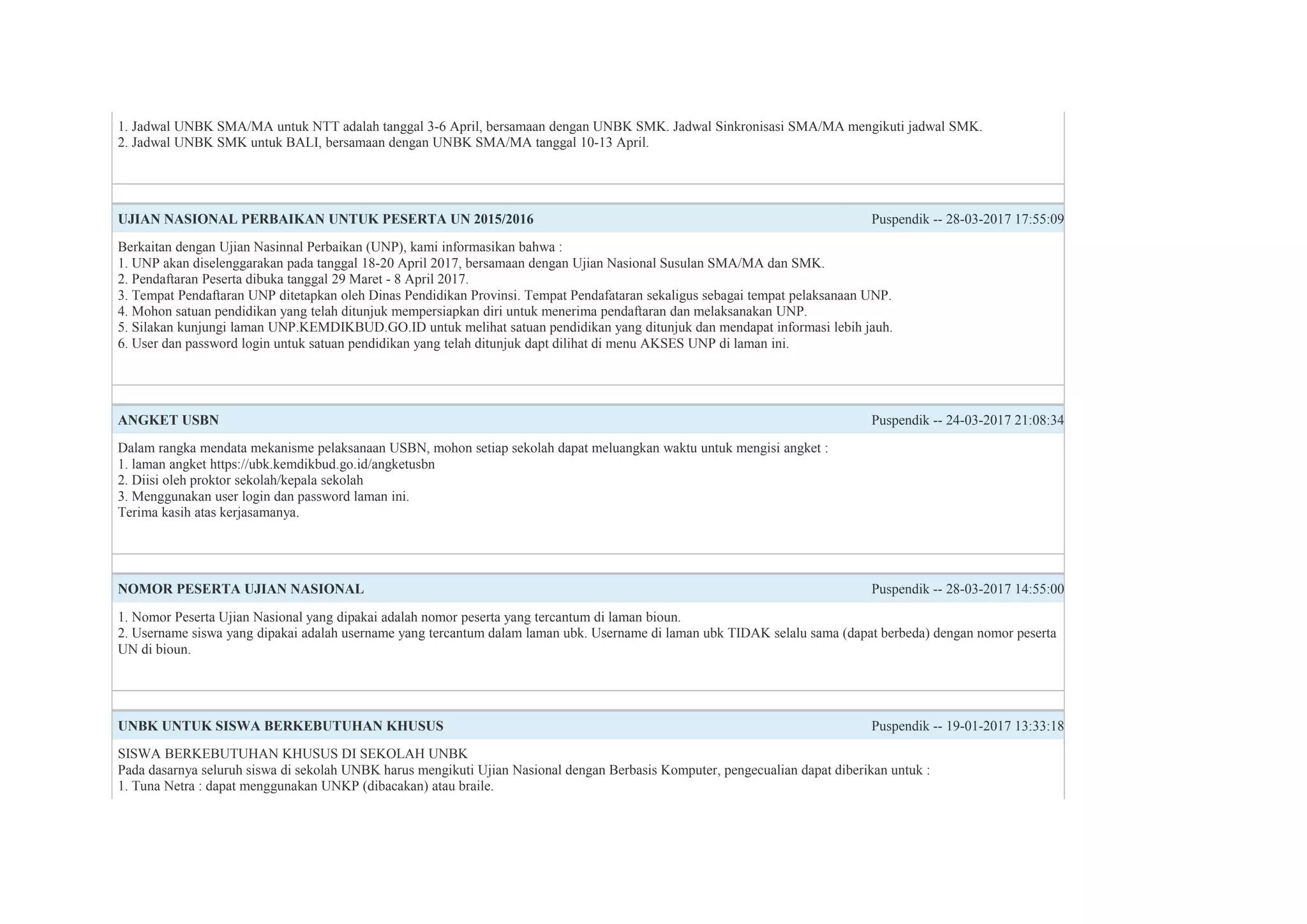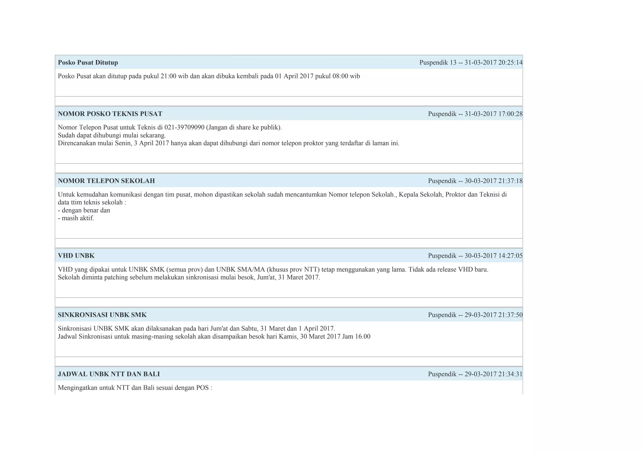 Posko pusat Puspendik akan ditutup pada 31 Maret 2017 dan dibuka kembali pada 1 April 2017. Sinkronisasi UNBK akan dilaksanakan pada 31 Maret dan 1 April untuk SMK, dan jadwal UNBK untuk SMA/MA di NTT dan Bali juga telah ditentukan. Pendaftaran ujian nasional perbaikan dibuka dari 29 Maret hingga 8 April 2017, dengan ujian berlangsung pada 18-20 April 2017.