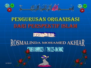 Dokumen ini membahas pengurusan organisasi dari perspektif Islam, menyoroti pentingnya prinsip seperti khilafah dan amanah dalam membentuk kepimpinan yang beretika. Penekanan pada pengelolaan yang efektif serta nilai-nilai Islami mendorong pencapaian matlamat organisasi selaras dengan ajaran Islam. Konflik dalam organisasi dibahas sebagai fenomena yang alami, dengan pendekatan Islam sebagai panduan untuk penyelesaiannya.