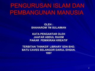 Dokumen tersebut membahas tentang pengurusan Islam dan etika kerja dalam perspektif Islam, termasuk prinsip-prinsip kerja sebagai ibadah, nilai-nilai etika kerja Islam, dan ciri-ciri kepimpinan yang baik menurut Islam.