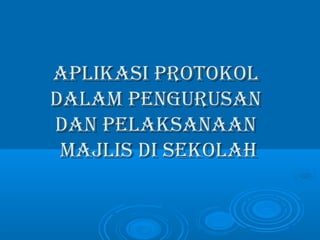 Dokumen ini membincangkan pengurusan dan protokol dalam pelaksanaan majlis di sekolah, termasuk definisi majlis dan protokol, serta kategori majlis. Ia juga menerangkan elemen penting dalam pengurusan majlis seperti susunan tempat duduk, penyambut tetamu, dan pemilihan pakaian yang sesuai. Kesimpulannya menekankan bahawa protokol adalah penting untuk menjaga kesopanan dan tatasusila dalam majlis rasmi.
