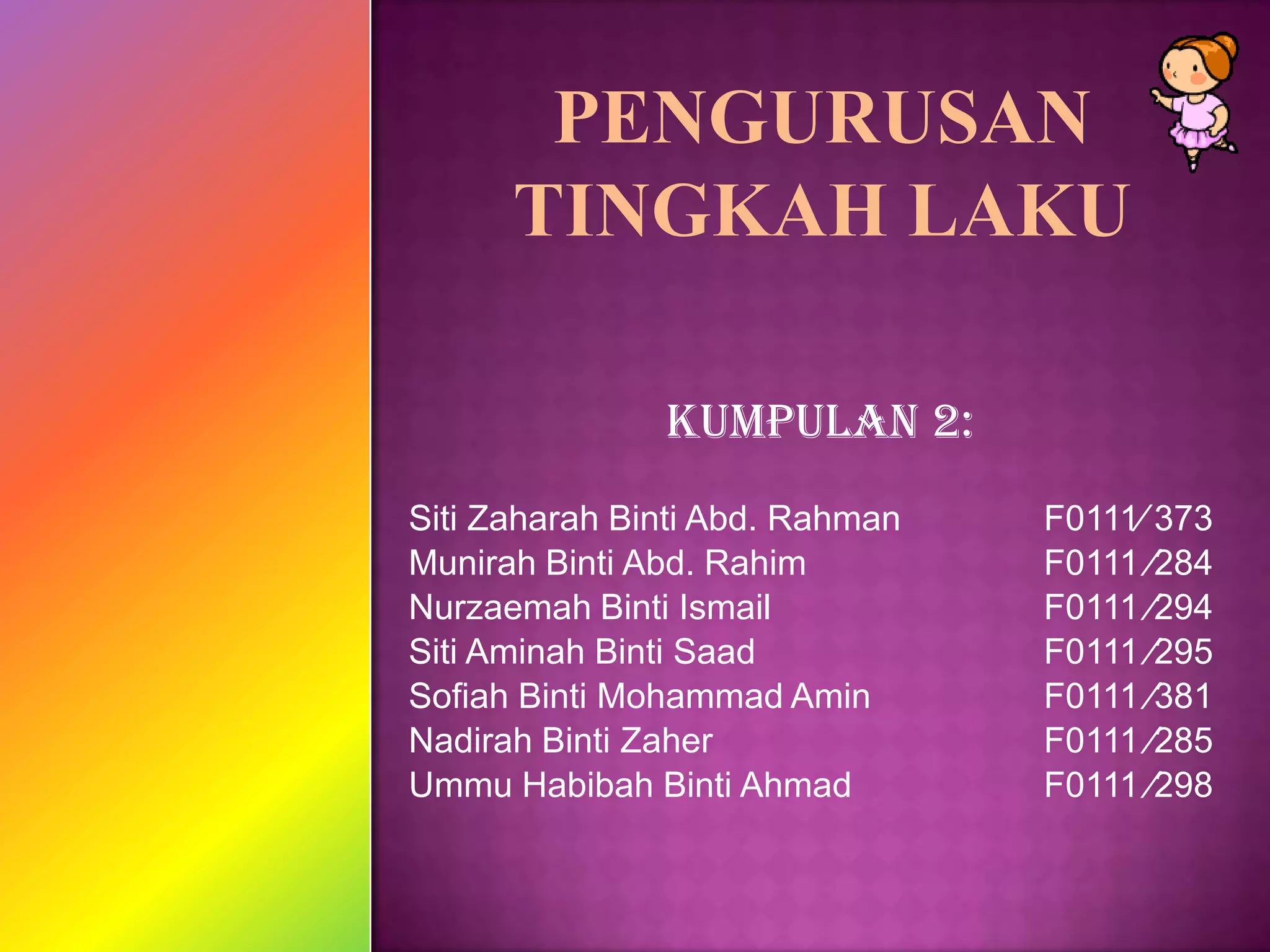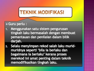 Dokumen ini membincangkan teknik-teknik modifikasi tingkah laku untuk mengubah tingkah laku bermasalah pelajar melalui ganjaran dan hukuman. Ia menekankan pentingnya pengukuhan positif, serta penggunaan peneguhan negatif dan kaedah psikologi untuk mengubah tingkah laku negatif kepada positif. Selain itu, ia menyoroti peranan guru dalam menetapkan matlamat dan memberi bimbingan serta pujian bagi meningkatkan tingkah laku pelajar.