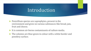 Penicilliosis is an infection caused by Penicillium marneffei that predominantly affects HIV-positive individuals in Southeast Asia. It is characterized by fever, skin lesions, anemia, lymphadenopathy and hepatomegaly. Laboratory diagnosis involves examining specimens such as blood, bone marrow and tissue under a microscope to identify the characteristic yeast and mold forms. Treatment involves antifungal medications such as amphotericin B or oral itraconazole.