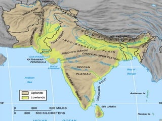 The Peninsular Plateau of India consists of two broad divisions: the Central Highlands and the Deccan Plateau. The Central Highlands lie north of the Narmada River and include the Malwa Plateau and Vindhya Range. The Deccan Plateau is a triangular landmass south of the Narmada that extends over eight states and contains diverse habitats bounded by the Western Ghats, Eastern Ghats, and various mountain ranges. The Western Ghats are higher and more continuous than the dissected and irregular Eastern Ghats.