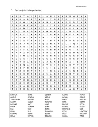 The document provides a list of Indonesian words in alphabetical order that can be paired together based on similar meanings. The reader is instructed to match the words in the two columns. Some examples of pairs that could be matched include: KUNTUM (blossom) and BUNGKUS (bundle), GUGUS (cluster) and KEPUL (puff), JAMBANGAN (spike) and JAMBAK (tassel).