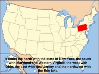 This document provides information about the geography, cities, rivers, and landmarks of Pennsylvania. It states that Pennsylvania borders New York, Maryland, West Virginia, Ohio, and New Jersey, with Philadelphia as its capital city. It also mentions that Pittsburgh and Allentown are among its most populated cities after Philadelphia, and describes regions like the Pocono Mountains, rivers including the Delaware and Allegheny, and locations such as Fairmount Park, the Bartram Garden, and the city of Bethlehem.