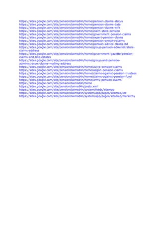 The document contains links to pages on two websites - pensionclaimsm2 and pensionclaimsd4n - that provide information about various topics related to pension claims, including making pension claims, types of pension claims against different organizations, and the pension claims process. The pages cover topics such as pension claims companies, claiming state pensions, and making claims against pension funds or trustees.