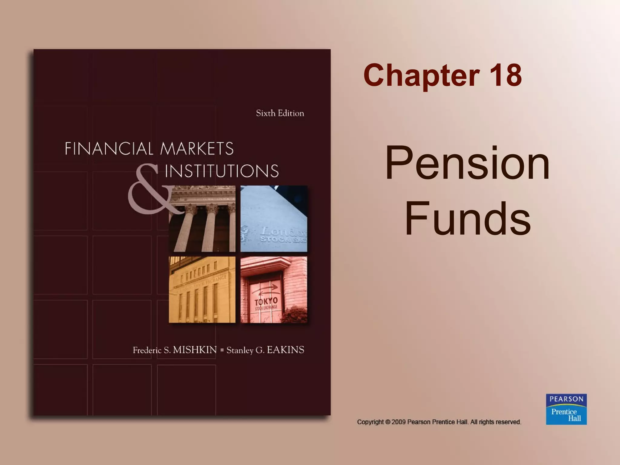 Pension plans provide income for retirees. There are two main types - defined benefit plans where employers promise specific payments, and defined contribution plans where payments depend on contributions and investment returns. Pension regulation aims to ensure adequate funding and protect benefits, as some plans have failed to pay full benefits. The future of pensions may include growth in variety of plans and influence of large pension funds as major stockholders.