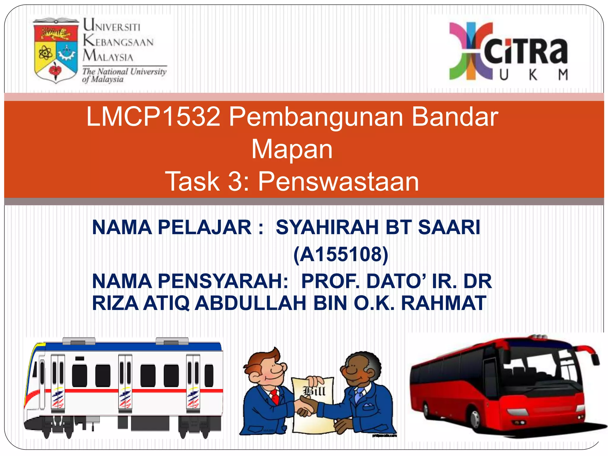 Dokumen ini membincangkan penswastaan di Malaysia yang diperkenalkan pada tahun 1983 untuk meningkatkan peranan sektor swasta dalam ekonomi. Ia mencadangkan kaedah pelaksanaan penswastaan dan menyoroti masalah projek pembangunan di sebuah majlis perbandaran yang kekurangan dana. Cadangan penyelesaian termasuk pemindahan hak milik tanah dan pembinaan kemudahan baru.
