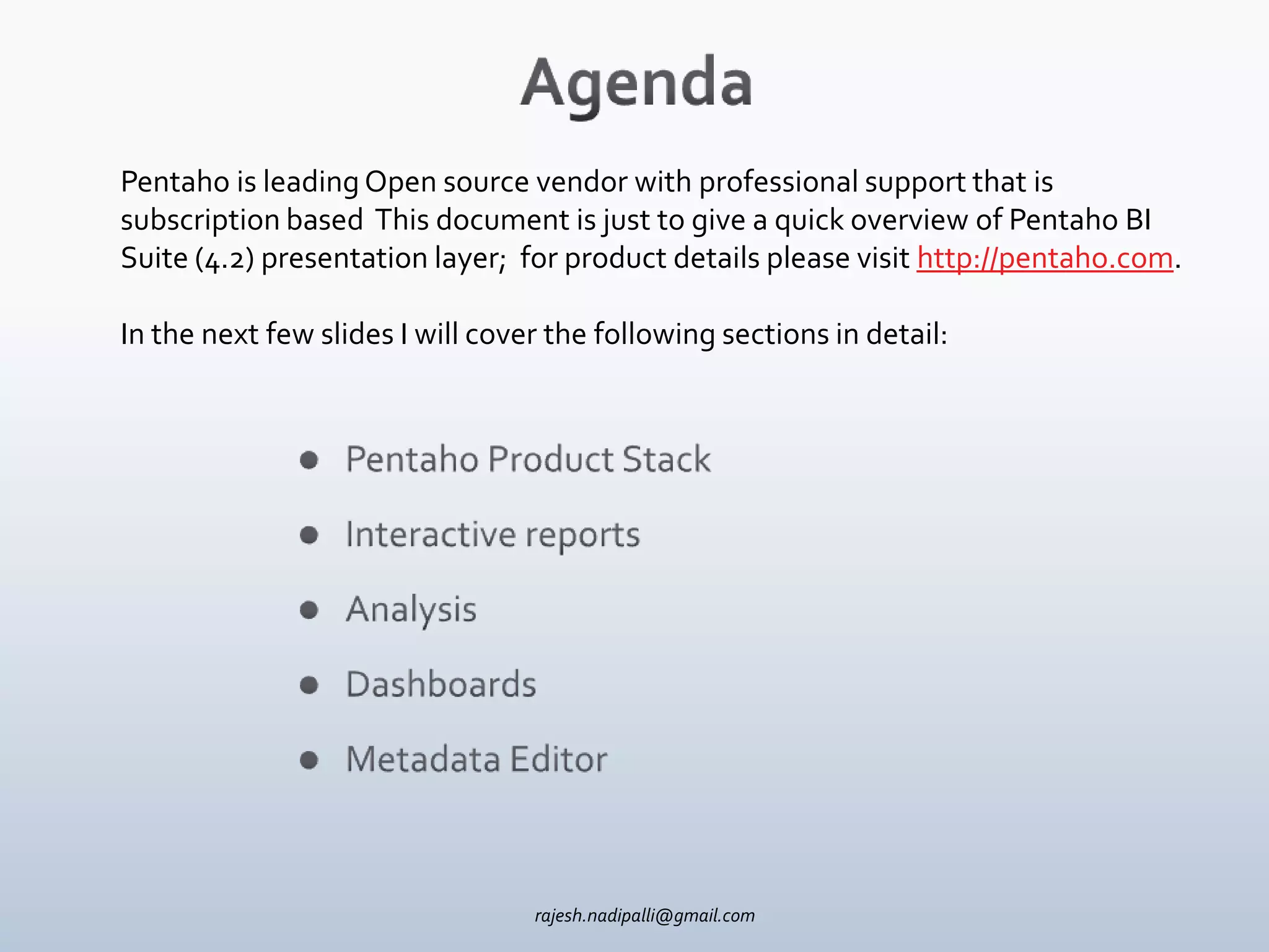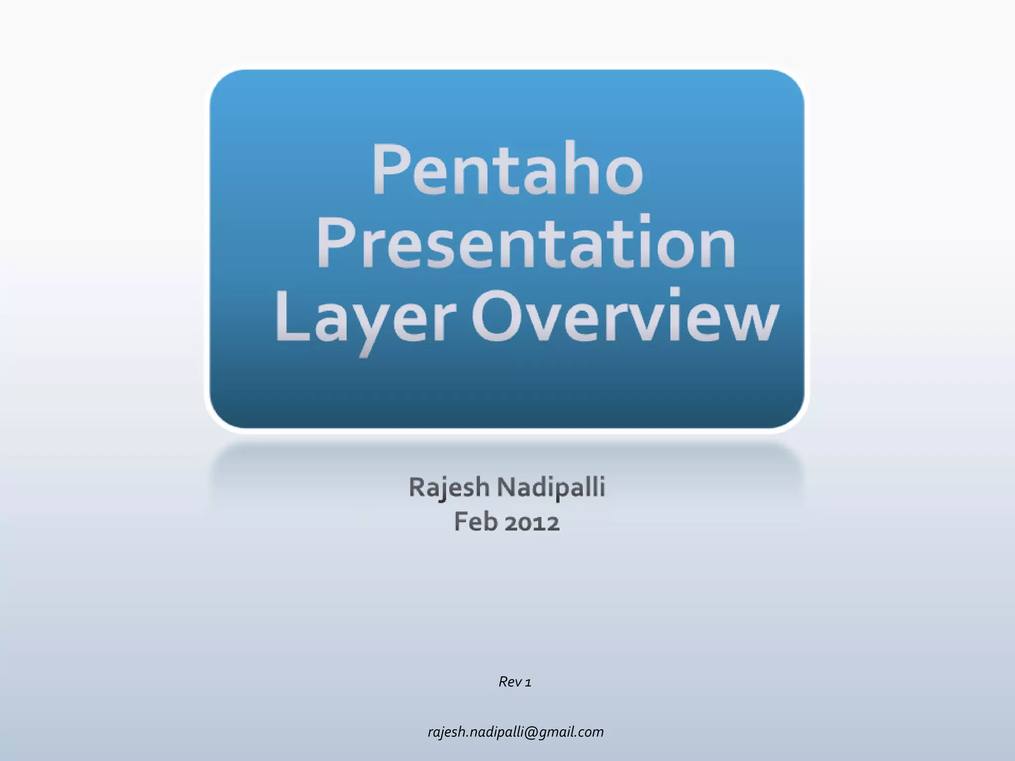 The document provides an overview of the Pentaho BI Suite presentation layer. It discusses interactive reports, which allow casual users to access data sources through drag and drop fields; Analyzer, designed for power users to access data sources and perform advanced sorting/filtering with charts; and Dashboards, which allow easy construction of layouts including dynamic filters and any Pentaho reports. The presentation is accompanied by screenshots demonstrating the creation and customization of reports and dashboards.