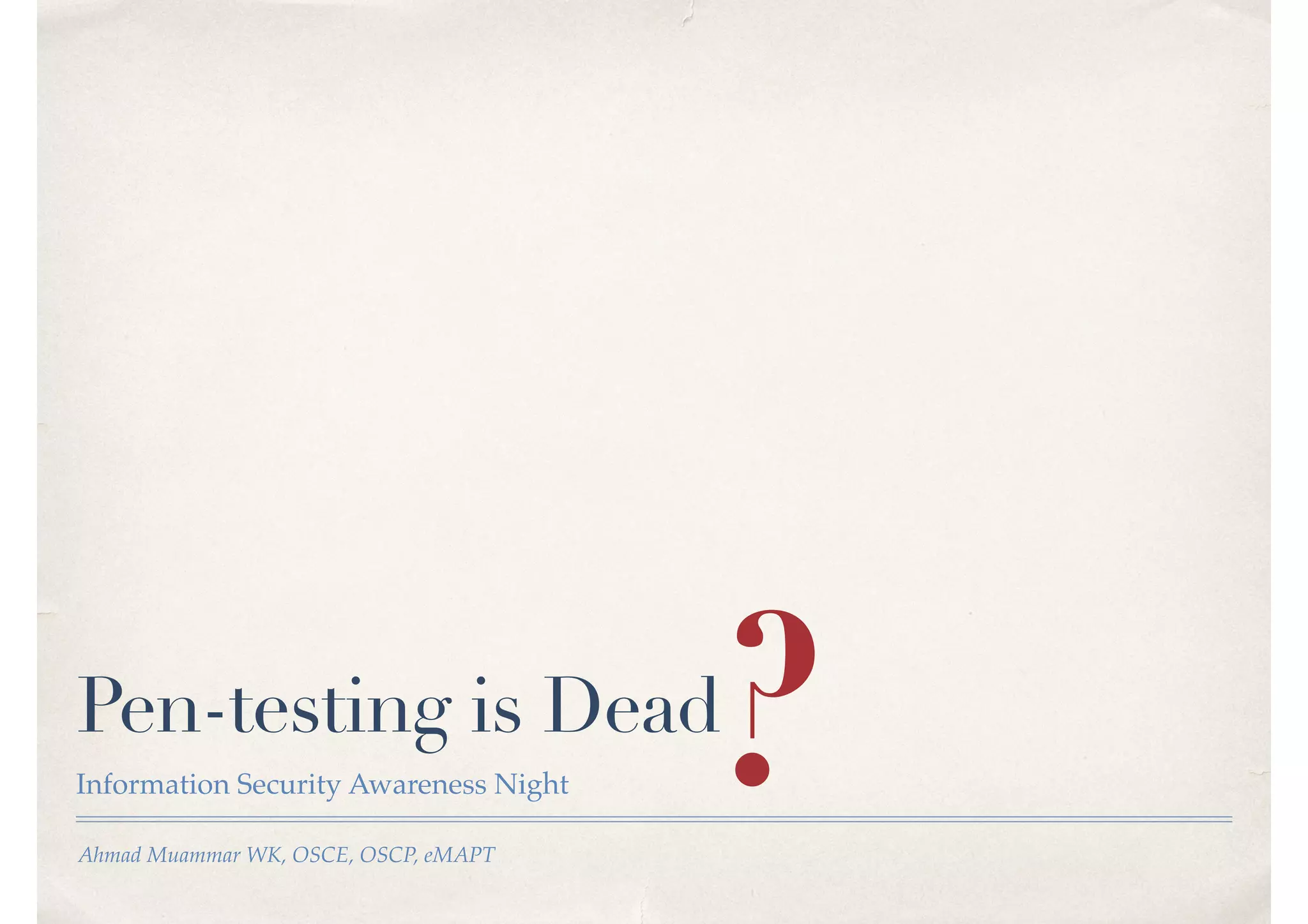 Ahmad Muammar discusses the misconceptions surrounding penetration testing, arguing that it is not dead but evolves alongside practices like bug bounty programs and red team assessments. He emphasizes that while these methods serve distinct purposes, they should complement each other to ensure thorough security evaluations. The presentation highlights the importance of adapting penetration testing to modern development practices, such as Agile methodologies and Industry 4.0 technologies.
