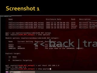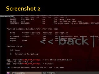 This document discusses penetration testing and the Metasploit framework. It defines penetration testing as evaluating a system's security using malicious techniques to identify vulnerabilities. Metasploit is an open-source framework for penetration testing that contains exploits, payloads, and modules. It can be used to test applications, operating systems, and web applications for vulnerabilities. The document provides examples of commands in msfconsole like 'use exploit' and 'set payload' to launch attacks using Metasploit.
