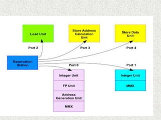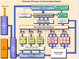 The Pentium III was a desktop and mobile CPU produced by Intel between 1999-2003. It had clock speeds between 400 MHz to 1.4 GHz and included features like MMX and SSE instructions. There were several stepping of the Pentium III including Katmai at 0.25 μm, Coppermine at 0.18 μm, Coppermine T at 0.18 μm, and Tualatin at 0.13 μm. Each stepping improved performance through higher clock speeds, larger caches, and support for newer instruction sets. Optimizing code for the Pentium III microarchitecture required techniques like scheduling instructions to maximize decoder throughput, balancing usage of execution units, and minimizing register dependencies. The Pentium III was also notable for including
