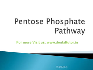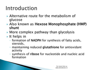 The pentose phosphate pathway, also known as the hexose monophosphate shunt, is an alternative metabolic pathway to glycolysis that occurs in the cytosol. It is a complex pathway that helps generate NADPH for fatty acid synthesis and glutathione for antioxidant activity, as well as synthesizing ribose-5-phosphate for nucleotide and nucleic acid formation. Glucose-6-phosphate enters the pathway and is oxidized through a two-phase process involving dehydrogenation using NADP+ instead of NAD+. Several intermediates are formed and rearranged before regenerating glucose-6-phosphate and glyceraldehyde-3-phosphate to complete the nonoxidative phase. Genetic defects in glucose-6