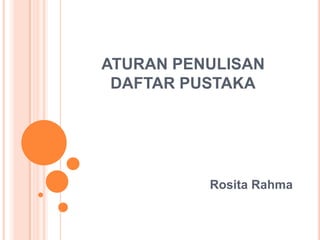Dokumen tersebut memberikan pedoman penulisan daftar pustaka untuk berbagai sumber referensi yang mencakup jurnal, buku, sumber di luar jurnal dan buku, serta sumber dari internet. Pedoman tersebut mencakup cara penulisan nama penulis, judul, penerbitan, dan informasi pendukung lainnya sesuai dengan jenis sumber yang digunakan.
