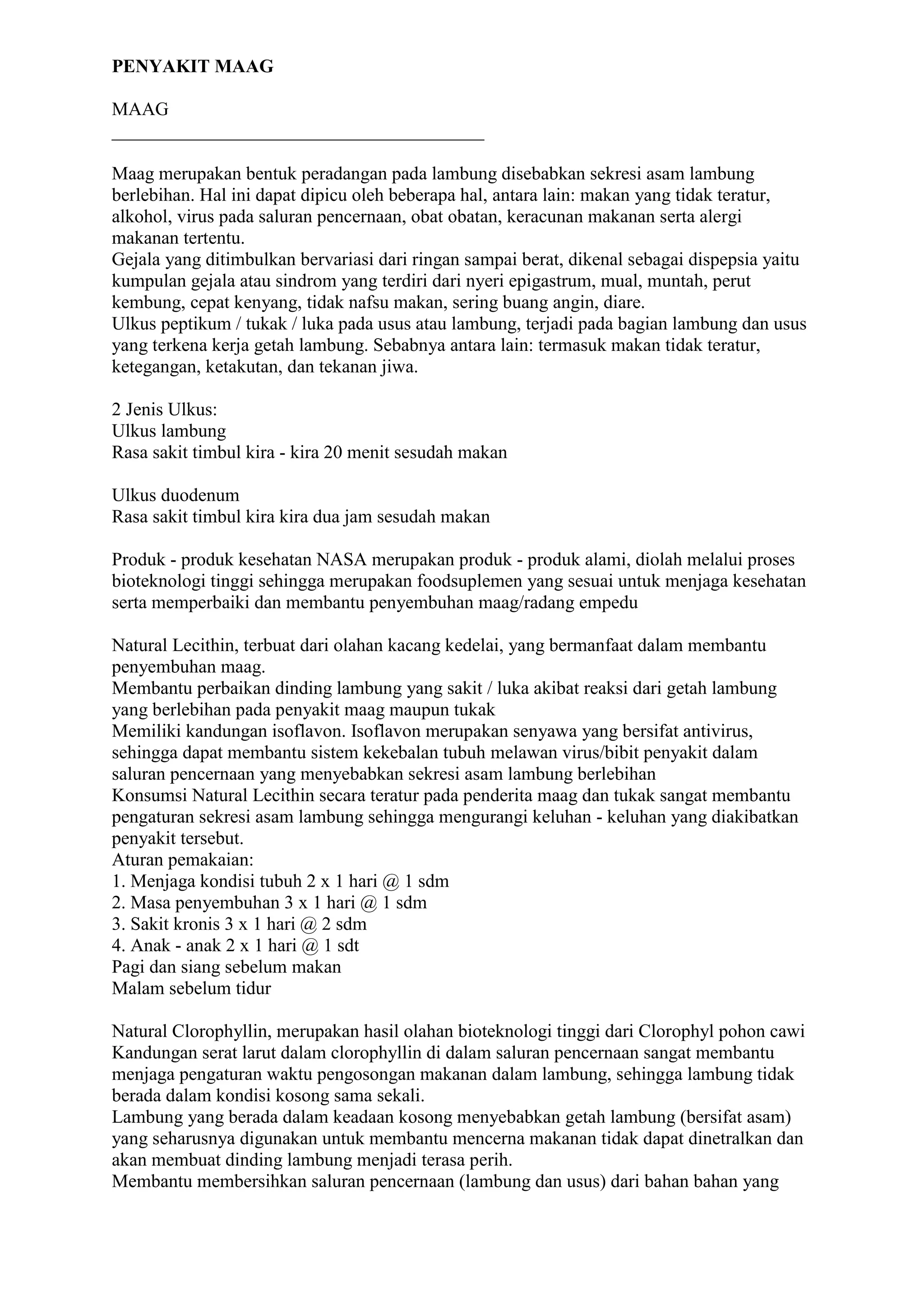 Penyakit maag adalah peradangan pada lambung akibat sekresi asam lambung berlebihan, dipicu oleh pola makan tidak teratur, alkohol, dan stres. Gejala meliputi nyeri perut, mual, dan dispepsia, sementara beberapa produk kesehatan alami dapat membantu mengatur sekresi asam lambung. Perawatan termasuk konsumsi suplemen seperti natural lecithin dan asam amino, serta menerapkan pola makan teratur dan menghindari makanan pemicu.