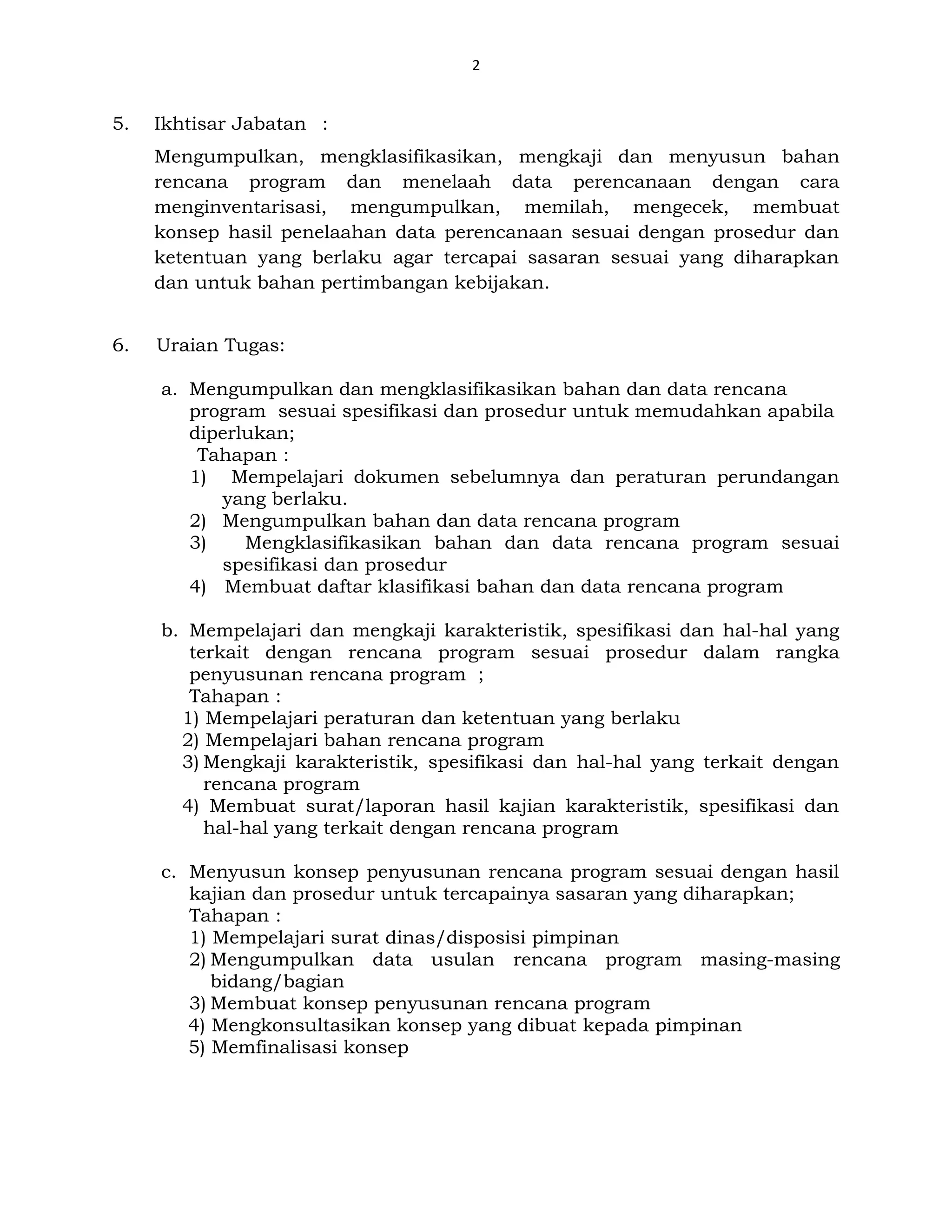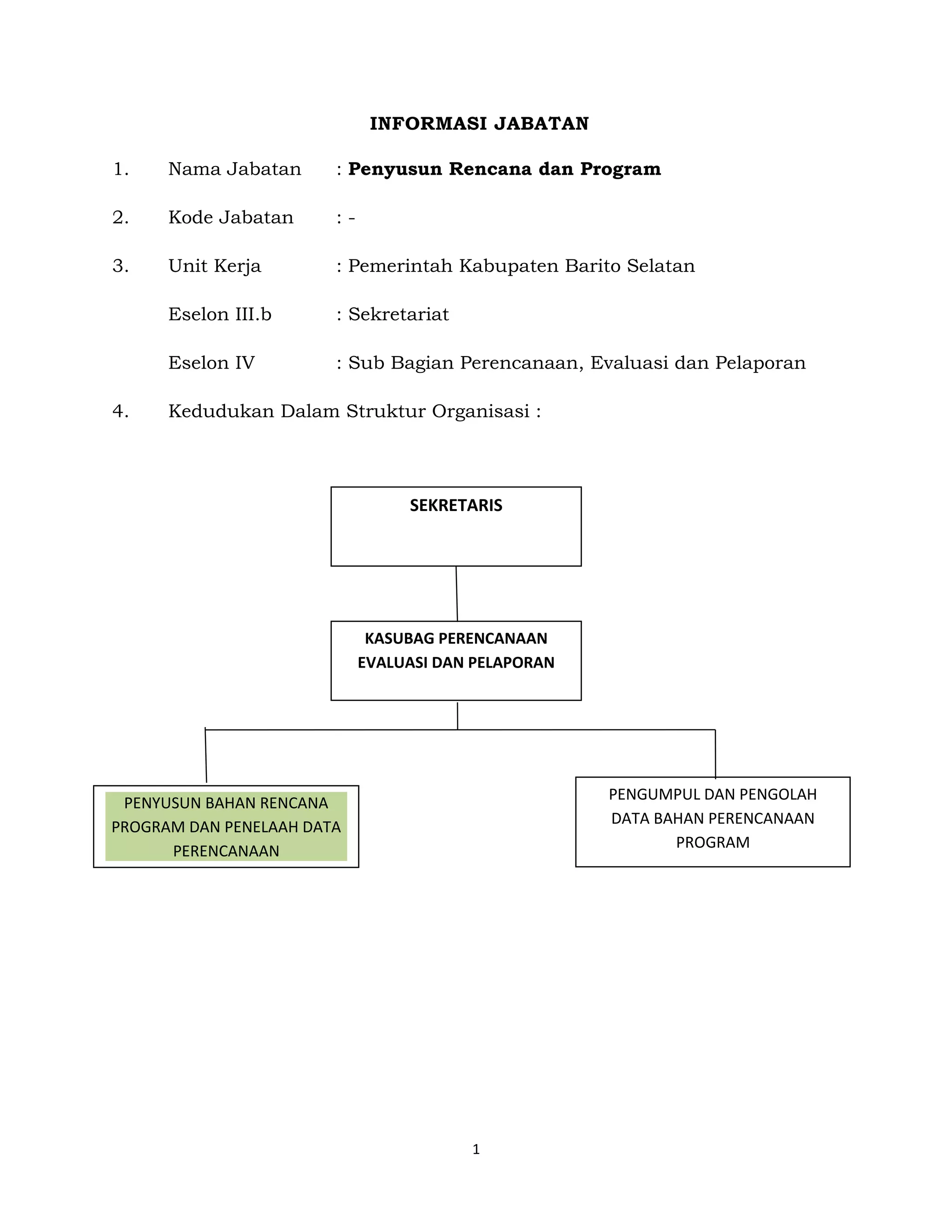 Dokumen ini menjelaskan jabatan penyusun rencana dan program di pemerintah kabupaten Barito Selatan, termasuk tanggung jawab, tugas, dan syarat jabatan. Tugas utama mencakup pengumpulan dan pengolahan data untuk merumuskan program yang sesuai dengan prosedur dan regulasi yang berlaku. Jabatan ini juga memerlukan pendidikan S1 dan pengalaman di bidang perencanaan.