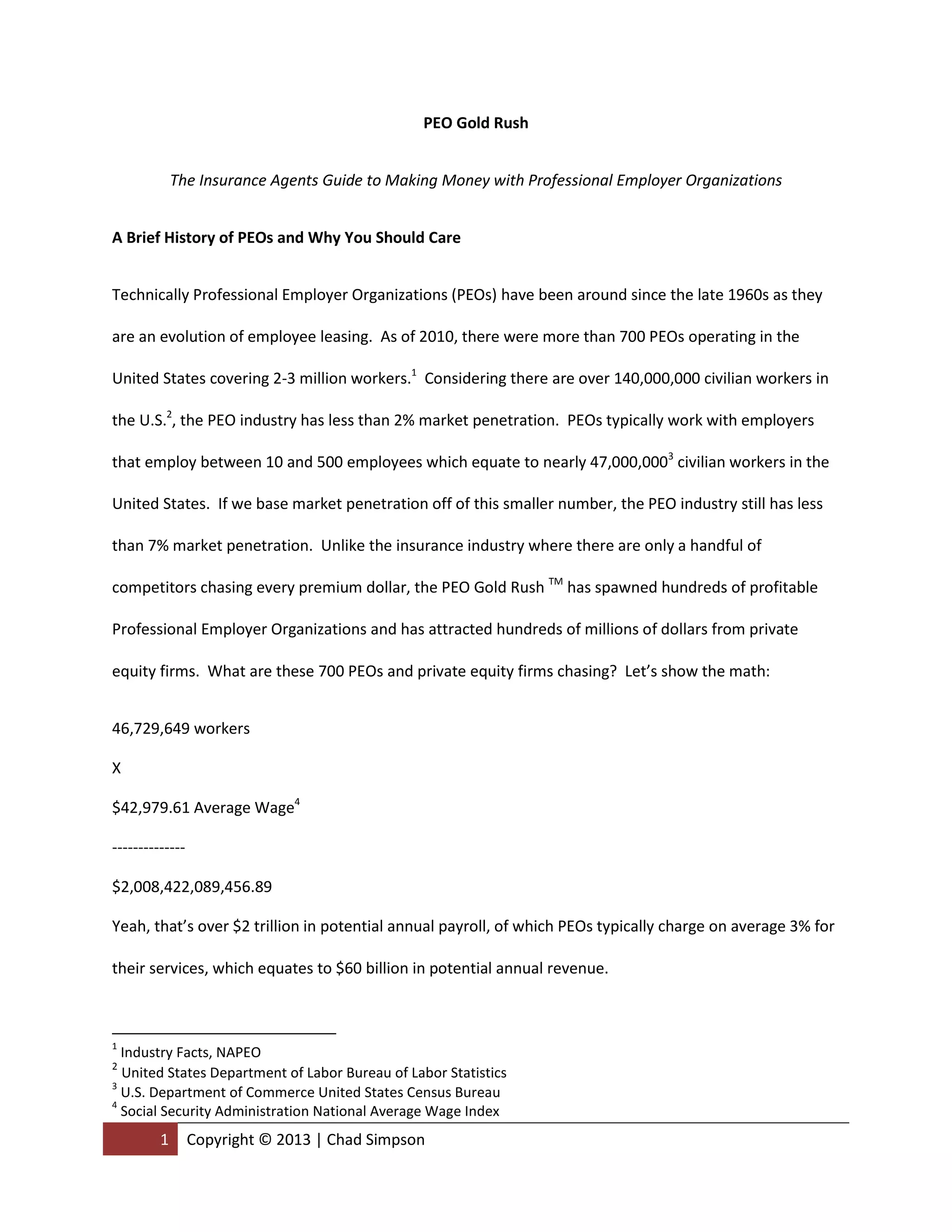 The document outlines the potential of Professional Employer Organizations (PEOs) in the U.S., which have a market penetration of less than 7% among small businesses. PEOs provide administrative support and compliance assistance, allowing small business owners to focus on core activities while minimizing liability. Insurance agents can leverage their existing client relationships to introduce PEO services, creating new revenue streams and enhancing client value.