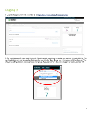 This document provides guidance on updating or creating new staff position descriptions in the PeopleAdmin system at Roosevelt University. It outlines the steps to log in to PeopleAdmin, navigate to position management, and update or create a new position description. Key steps include selecting the appropriate position, justifying any changes, updating classification and position details, and entering job duties before submitting for approval workflow. The guide aims to standardize position descriptions in accordance with HR guidelines.