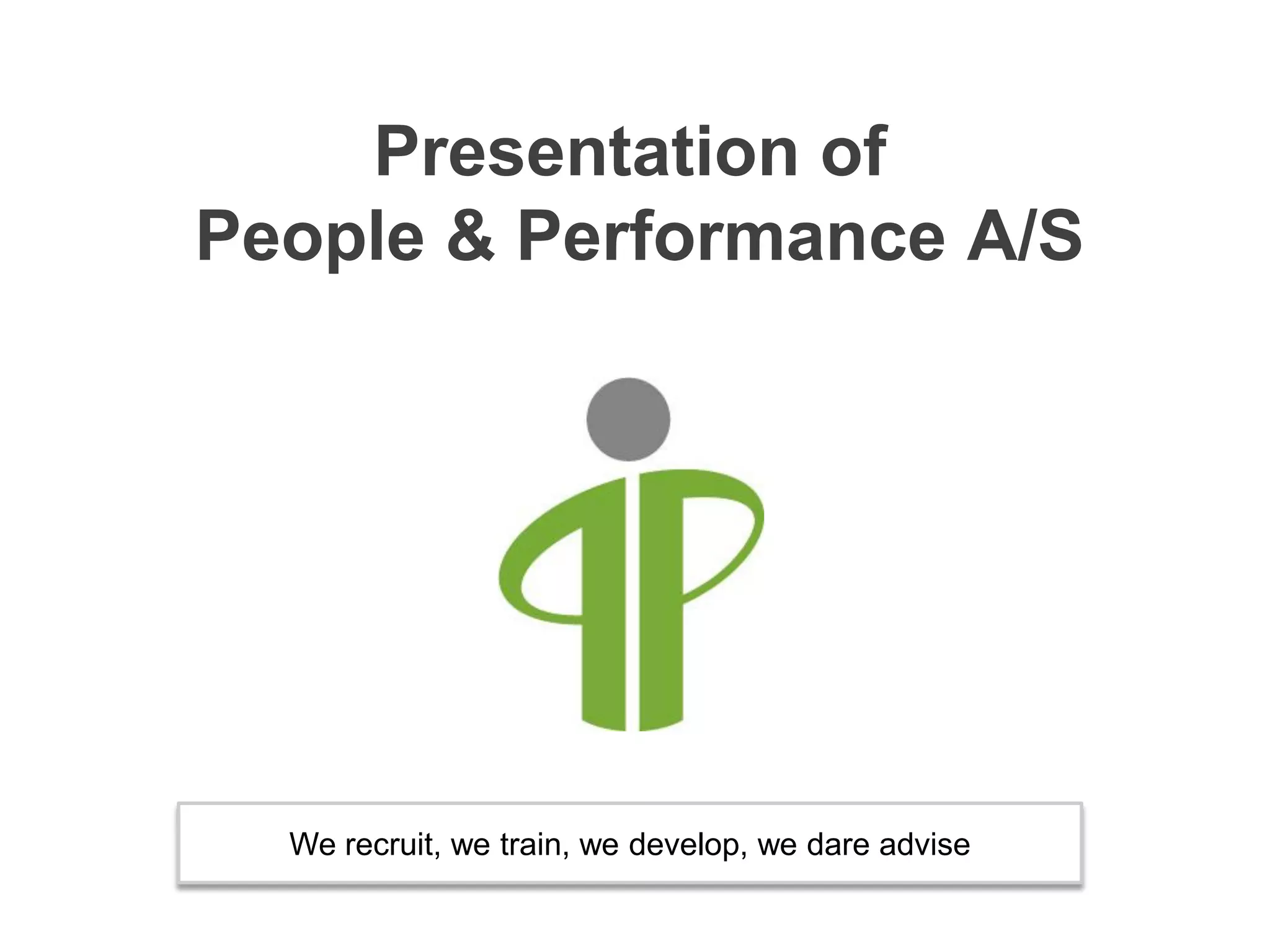 People & Performance A/S is a Danish consulting firm that specializes in recruitment, training, development, and advising. They recruit candidates and place them in positions at client companies. The document outlines their approach, business areas, experience working with companies globally, and recruiting process. They aim to provide customized solutions and have a database of candidates and recruitment experience since 2007.