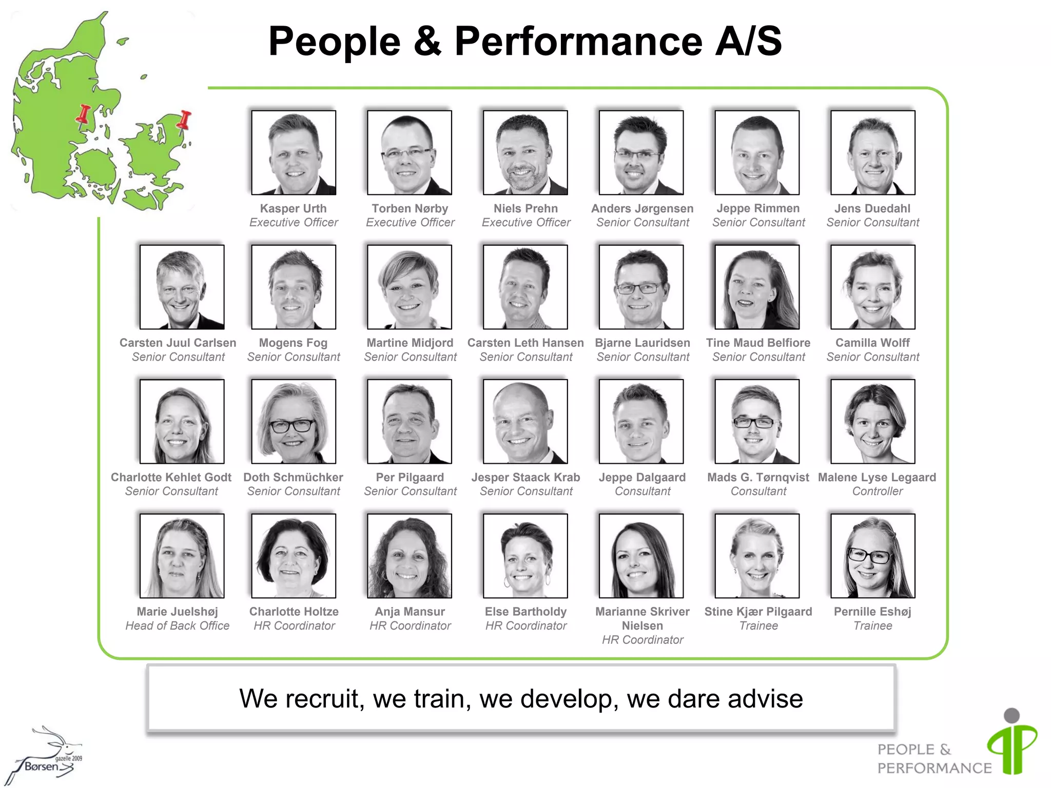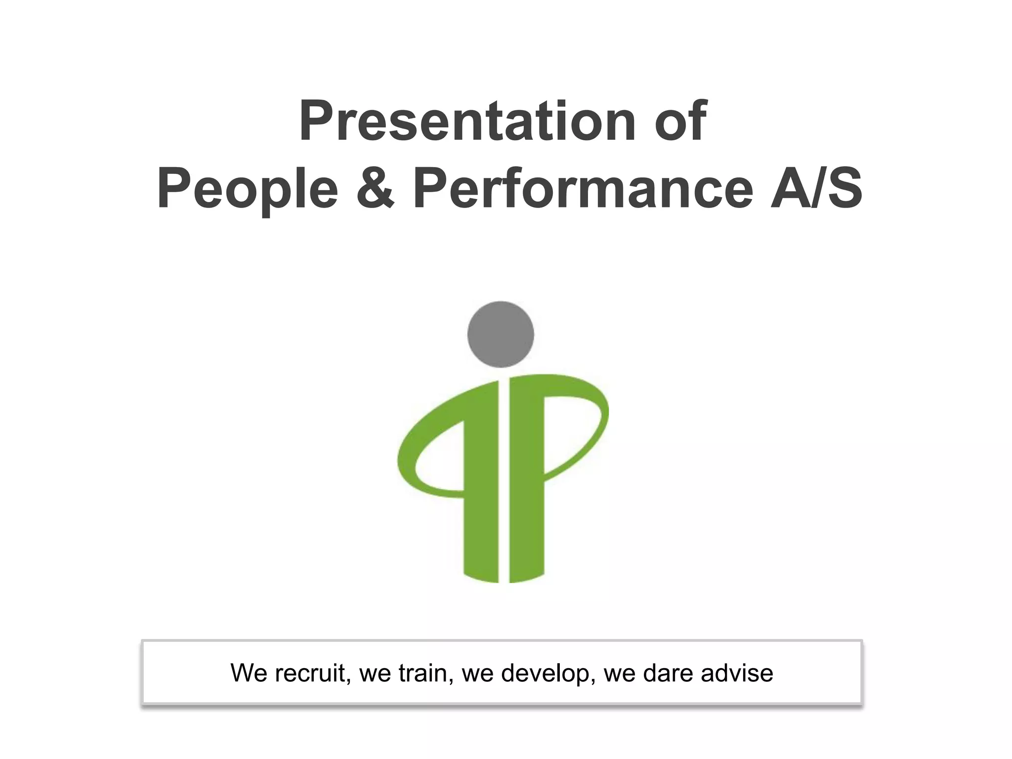 People & Performance A/S is a Danish consulting firm that specializes in recruitment, training, leadership development, and advising. They list their executive officers, senior consultants, and other staff. The document describes their approach, which focuses on strategy, culture, competencies, and people. It outlines their business areas such as performance management, leadership development, and organizational change. Finally, it provides details on their recruitment process and what makes their recruitment services unique, including their consultants' experience, candidate database, and assessment tools.