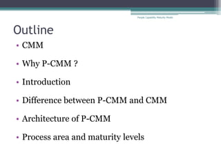 The document discusses the People Capability Maturity Model (P-CMM), which is a framework for improving an organization's management and development of human assets. P-CMM provides an improvement path and integrates workforce development with process improvement. It differs from the CMM model by focusing specifically on workforce practices rather than general organizational processes. P-CMM has a five-stage architecture moving from initial ad-hoc people management to optimizing continuous improvement of individual competence and workforce motivation. The document outlines P-CMM and compares it to CMM, discussing its architecture and maturity levels.