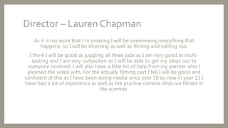 Lauren Chapman will direct, film, and edit the music video. As the creator of the project, she will oversee all aspects of production. Lauren is experienced with media production and confident she can juggle multiple roles. Alex Hallam and Thomas Grace were chosen to play brothers due to their similar appearance and longstanding friendship. This creates chemistry on screen. Reece Griffiths was selected as the lead singer due to his indie style and ability to collaborate on ideas. Sharon Bostock plays the mother role due to her outgoing personality and familiarity. Ewelina Stefan plays the girlfriend to match the on-screen chemistry with her real-life partner, one of the brothers.