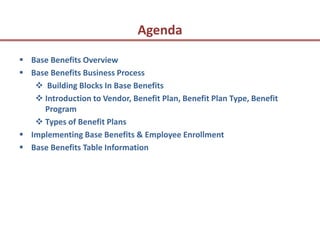 PeopleSoft Base Benefits allows companies to manage employee benefits. It includes tools to create unlimited benefit plans that are grouped into benefit types like health or savings. Base Benefits integrates with other PeopleSoft applications and can administer COBRA and print HIPAA reports. Setting up base benefits involves four core phases - building supporting tables, creating benefit programs, assigning employees to programs, and calculating rates and deductions. Core tables must be set up first, then benefit plans are attached with details, plans are attached to programs, and finally employees are enrolled.