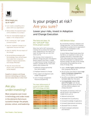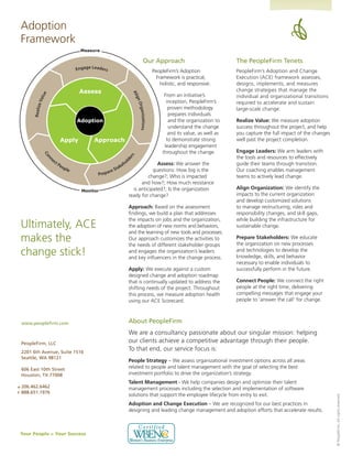 The document discusses adoption and change execution as a way to improve project success rates and organizational performance. It notes that over half of IT and process initiatives fail due to issues like ineffective leadership, employee resistance, and poor planning. The document introduces PeopleFirm's adoption and change execution framework, which assesses readiness for change, develops customized implementation plans, executes change management strategies, and measures adoption success. The framework aims to engage leaders, align the organization, prepare stakeholders, and connect people to changes in order to realize the full value of initiatives and make changes stick long-term.
