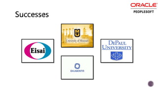 This document provides an overview of the PeopleSoft ERP software. It discusses that PeopleSoft was founded in 1987 and acquired by Oracle in 2005. It describes the evolution of PeopleSoft's products from its initial focus on HR to later additions of financial management, supply chain management, and other modules. The document also outlines some of PeopleSoft's core product lines like HCM, financial management, SRM, and supply chain management as well as its market share and some implementation failures and successes.