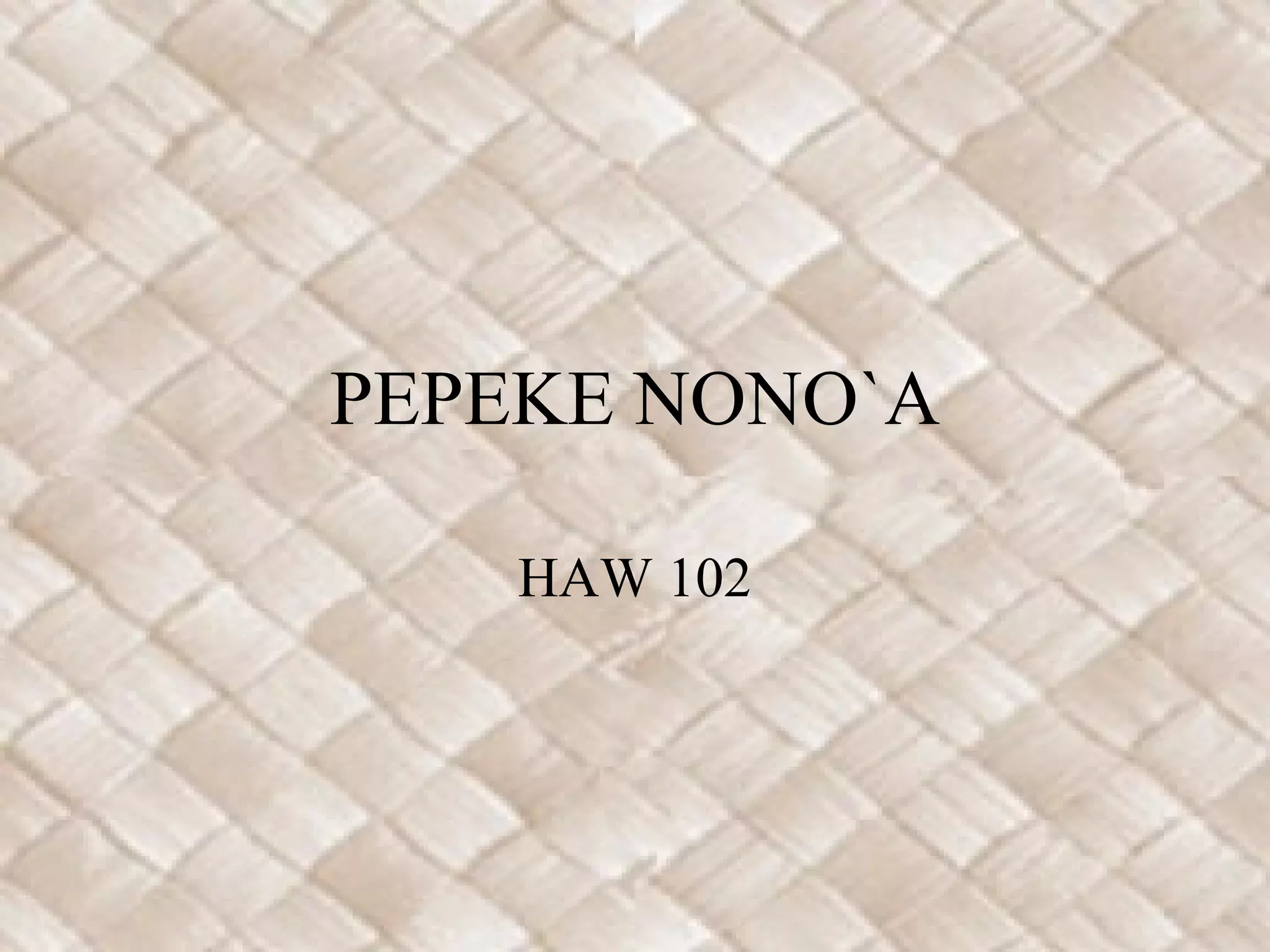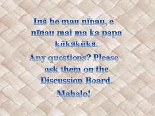 This document provides instruction on using Pepeke Nono'a sentences in Hawaiian to show possession or ownership of objects. Pepeke Nono'a sentences follow the structure "HE thing KO/KĀ possessor" and translate to English as "possessor has/had a thing". To make sentences plural, the word "MAU" is added after "HE". The document also contrasts Pepeke Nono'a sentences with Pepeke 'Aike He sentences, which use the structure to identify what something is rather than what it possesses.