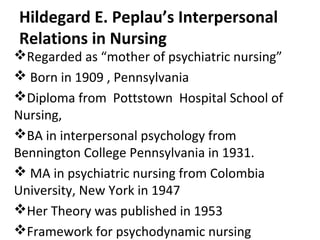 Hildegard Peplau developed the Interpersonal Relations Theory, which focuses on the nurse-patient relationship and its progression through four phases: orientation, identification, exploitation, and resolution. The theory emphasizes understanding interpersonal processes and developing therapeutic relationships. Peplau identified seven nursing roles to illustrate the dynamic character roles in clinical nursing, and her theory provides a framework for assessment, planning, intervention, and evaluation in caring for patients. Research has found the theory useful for educating oncology patients, ensuring understanding, and developing individualized care plans for families.