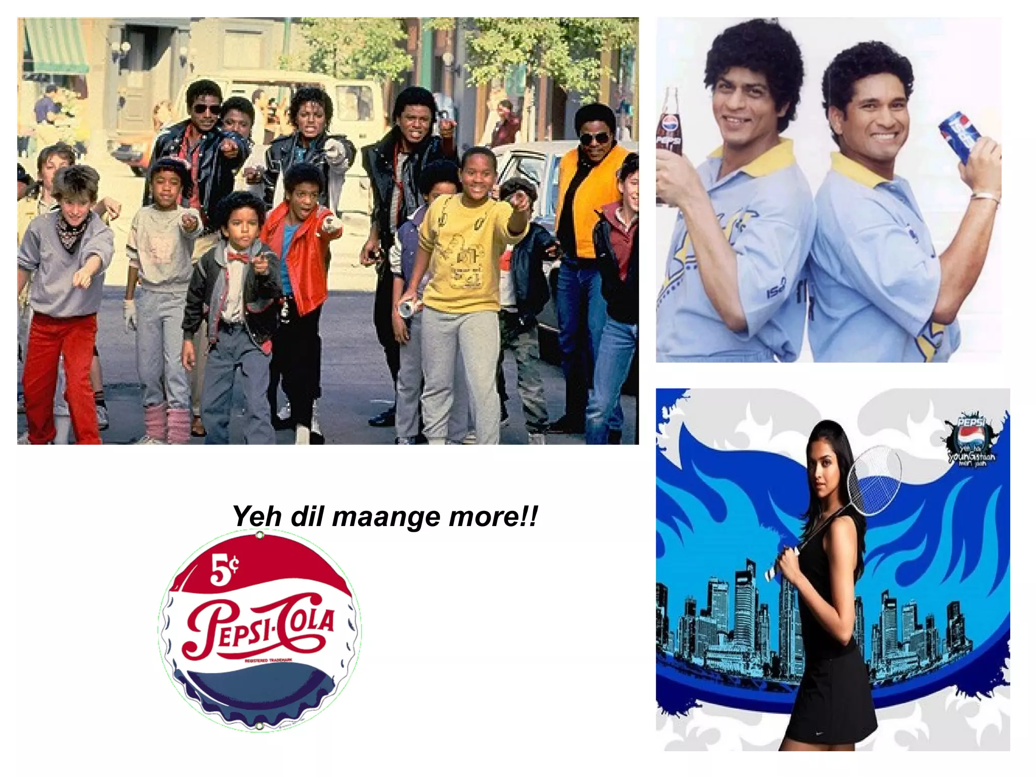 Pepsi is a soft drink produced since the 1890s and is now a large multinational corporation. It is sold worldwide and has numerous brand extensions. PepsiCo was formed through mergers and acquisitions and has over 180,000 employees globally. Pepsi targets younger consumers with hip advertising campaigns featuring popular celebrities and focuses on music, humor and sex appeal. It has had successes and failures expanding internationally and competing against Coca-Cola.