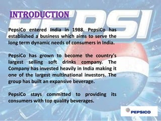 PepsiCo entered the Indian market in 1988 and has since become the largest selling soft drinks company in India through investments and establishing a business to serve the long-term needs of Indian consumers. The document provides details on PepsiCo's portfolio of brands including Pepsi, Mirinda, Mountain Dew and 7UP, as well as information on its business operations, marketing strategies of product, price, place and promotion, and mission to be the world's premier consumer products company.