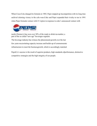 PepsiCo is a global food and beverage company with over $27 billion in annual revenues. It operates snack and beverage businesses across the world through brands like Frito-Lay, Pepsi, Gatorade, Tropicana, and Quaker. In India, PepsiCo entered in 1989 and has since grown to be the country's largest food and beverage company. It manufactures and sells beverages like Pepsi, Mountain Dew, 7UP, as well as snacks under brands like Lay's, Kurkure, Cheetos. PepsiCo has built a large distribution network in India with bottling plants and focuses on making its brands widely available through an intensive distribution strategy.