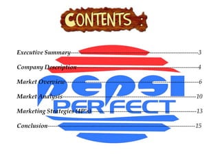 This document provides an overview of Pepsi's business in Pakistan. It begins with an executive summary of Pepsi's revenues, market share, and new product launch of Pepsi Perfect. It then covers Pepsi's company description, market analysis including segmentation, competitors, and SWOT analysis. The document also discusses Pepsi's marketing strategies of product, price, promotion, and placement. It concludes with suggestions to maintain Pepsi's market position through quality, reputation, and continuous new advertising approaches.