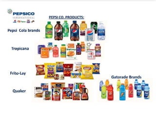 - It has three main business units: PepsiCo Americas Foods, PepsiCo Americas Beverages, and PepsiCo International. Major brands include Frito-Lay, Gatorade, Quaker, and Tropicana.