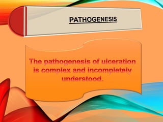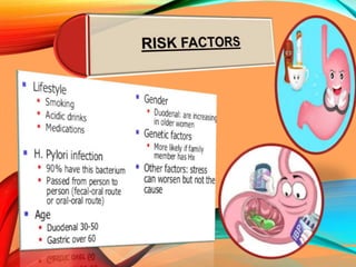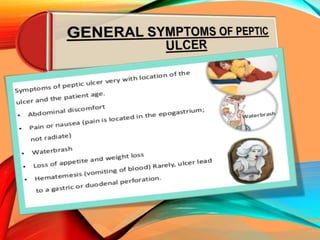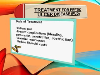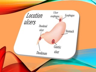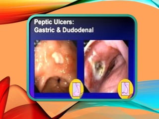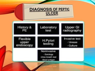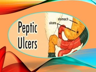 Peptic ulcers develop in the stomach, esophagus, or duodenum (upper small intestine) and are usually caused by H. pylori bacteria or nonsteroidal anti-inflammatory drugs (NSAIDs) like aspirin. Symptoms include abdominal pain, nausea, vomiting, weight loss, and bloody stools. Diagnosis involves blood tests, breath tests, stool tests, endoscopy, or imaging. Treatment involves antibiotics to kill H. pylori, proton pump inhibitors to reduce acid, and medications to protect the stomach lining. Complications can include bleeding, perforation, and scarring.