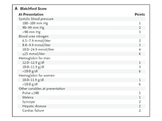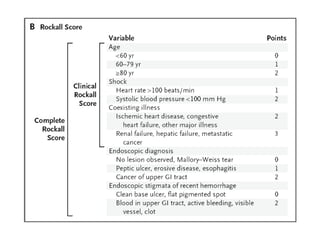This document summarizes the management of acute bleeding from peptic ulcers. The majority of acute upper GI bleeding is caused by peptic ulcers. Presenting signs include hematemesis and melena. Priority is given to assessing hemodynamic status, resuscitation, NG tube placement, and early endoscopy within 24 hours. Endoscopy allows classification of ulcers and identification of those with high-risk stigmata requiring endoscopic hemostasis treatment. Patients with high-risk ulcers are admitted and treated with IV PPIs. Those with low-risk ulcers may be discharged after endoscopy if stable, with oral PPI treatment. Surgery or radiology are considered if rebleeding occurs despite