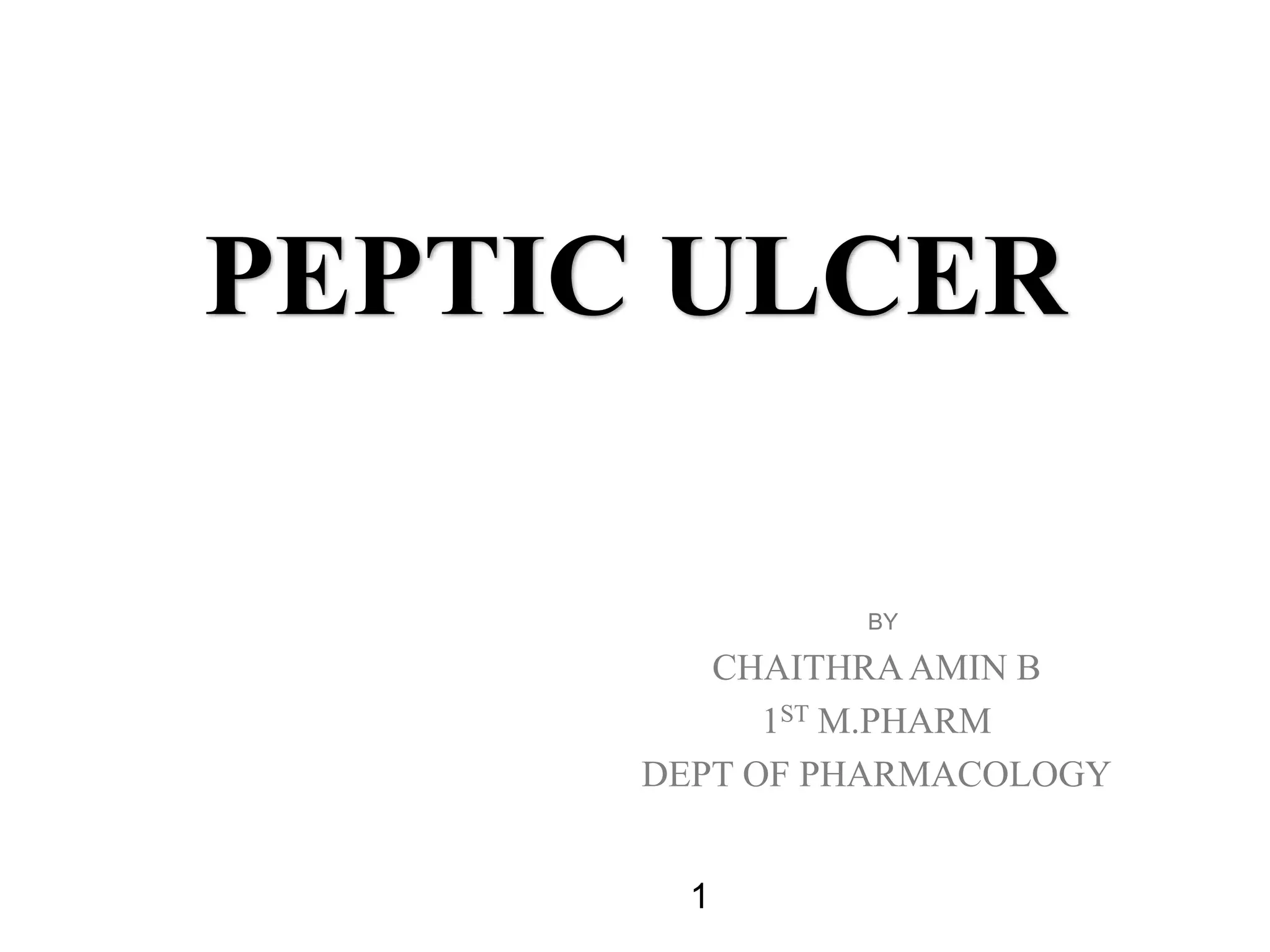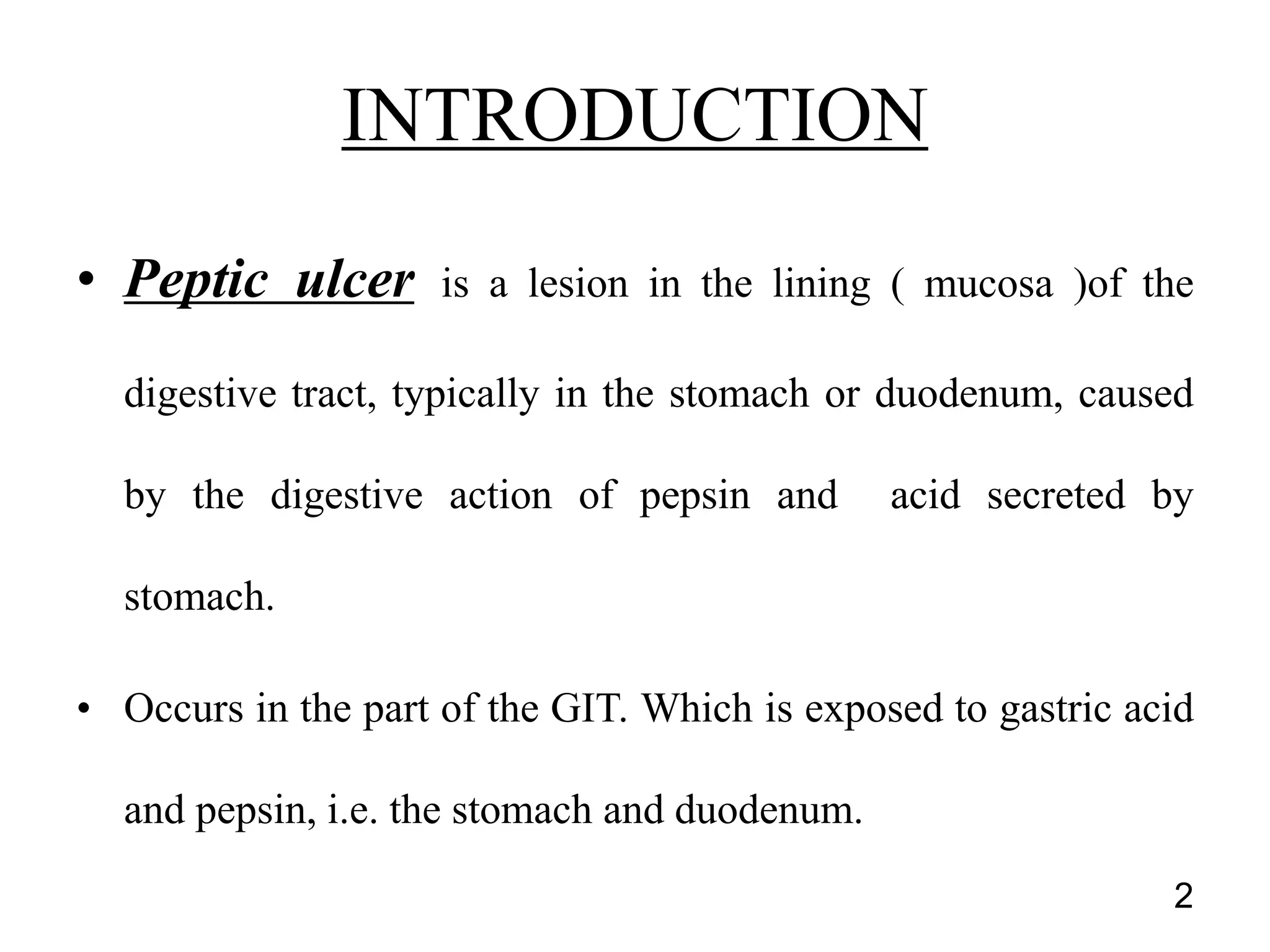 This document summarizes peptic ulcer disease. It begins by defining peptic ulcers as lesions in the stomach or duodenum caused by gastric acid and pepsin. Risk factors for peptic ulcers include an imbalance between aggressive factors like acid and protective mucosal defenses. Common symptoms are epigastric pain and weight loss. Treatment approaches aim to reduce acid secretion through H2 blockers, proton pump inhibitors, anticholinergics, and prostaglandin analogues. Other treatments include antacids to neutralize acid, ulcer protectives like sucralfate, and anti-H. pylori drugs to eradicate H. pylori infections which are a major cause of peptic ul