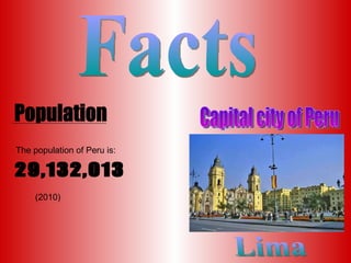 Peru is a South American country that borders Bolivia, Brazil, Chile, Columbia and Ecuador. With a population of over 29 million, over half of Peruvians live below the poverty line. The capital and largest city of Peru is Lima, and the country's most popular sport is football, though they did not qualify for the current World Cup.