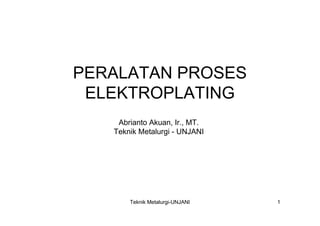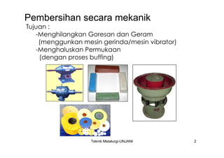 Dokumen ini menjelaskan berbagai metode pembersihan permukaan dalam proses elektroplating, termasuk pembersihan mekanik, penggunaan pelarut, dan pembersihan asam. Selain itu, dijelaskan juga kondisi operasi dan peralatan yang diperlukan dalam pelapisan logam, seperti rectifier dan bak pelapisan. Proses pengendalian larutan juga diuraikan untuk memastikan kualitas lapisan yang dihasilkan.