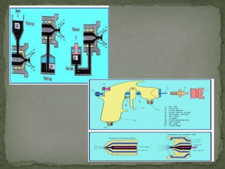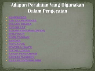 Dokumen tersebut membahas alat-alat yang digunakan dalam proses pengecatan kendaraan, termasuk kompresor, air transformer, selang udara, ruang cat, oven, spraygun, blok tangan, sander, pengaduk, spatula, pistol udara, papan pencampur, kertas masking, dan alat pelindung diri.