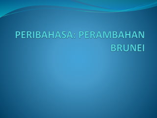 Perambahan Brunei merupakan ungkapan tradisional yang mengandungi makna dan pengajaran. Dokumen ini menjelaskan faedah penggunaan perambahan untuk menghiasi percakapan, menguatkan tujuan, dan sebagai wadah pengajaran. Beberapa contoh perambahan dan maknanya diberikan seperti "Aing ditetak indakan putus" yang bermakna pertalian kekeluargaan tidak akan putus walaupun bermusuhan, dan "Gila us