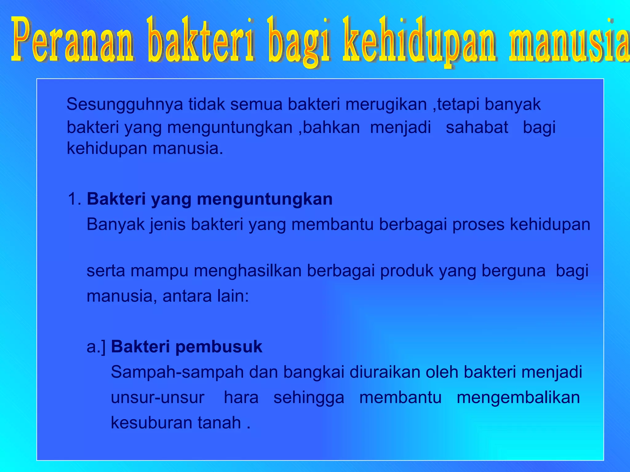 Dokumen ini menjelaskan peran bermanfaat dan merugikan bakteri dalam kehidupan manusia. Bakteri menguntungkan terlibat dalam proses seperti penguraian limbah, produksi makanan, dan pemrosesan nutrisi, sedangkan bakteri merugikan dapat menyebabkan penyakit pada manusia, hewan, dan tumbuhan serta merusak bahan pangan. Berbagai contoh spesifik bakteri dan dampaknya terhadap kesehatan dan lingkungan juga disajikan.