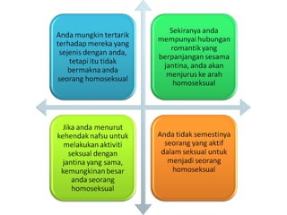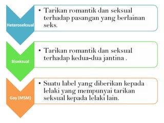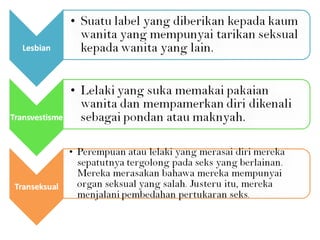 Dokumen tersebut membahas mengenai konsep gender dan perbedaan antara laki-laki dan perempuan secara biologis dan sosial. Juga membahas mengenai peran anggota keluarga dan orientasi seksual. Terdapat pembahasan mengenai kematangan seksual remaja dan prinsip R3 untuk bertanggung jawab atas tindakan seksual.