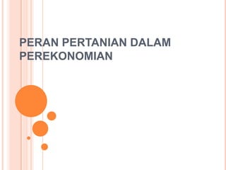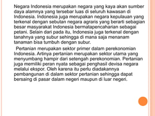 Dokumen tersebut membahas peran sektor pertanian dalam perekonomian Indonesia. Pertanian merupakan sektor primer utama yang menyumbang sekitar setengah PDB Indonesia dan menyerap tenaga kerja sebesar 42% penduduk yang bekerja. Subsektor perkebunan memberikan kontribusi penting terhadap PDB, ekspor, dan penyerapan tenaga kerja, dengan mengekspor komoditas seperti kelapa sawit, karet, dan kakao.