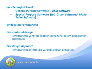 Dokumen tersebut membahas tentang jenis perangkat lunak, pendekatan perancangan sistem interaksi manusia komputer yang user-centered, serta prinsip dan komponen antarmuka pengguna yang terdiri atas model pengguna, bahasa perintah, umpanbalik, dan penampilan informasi.